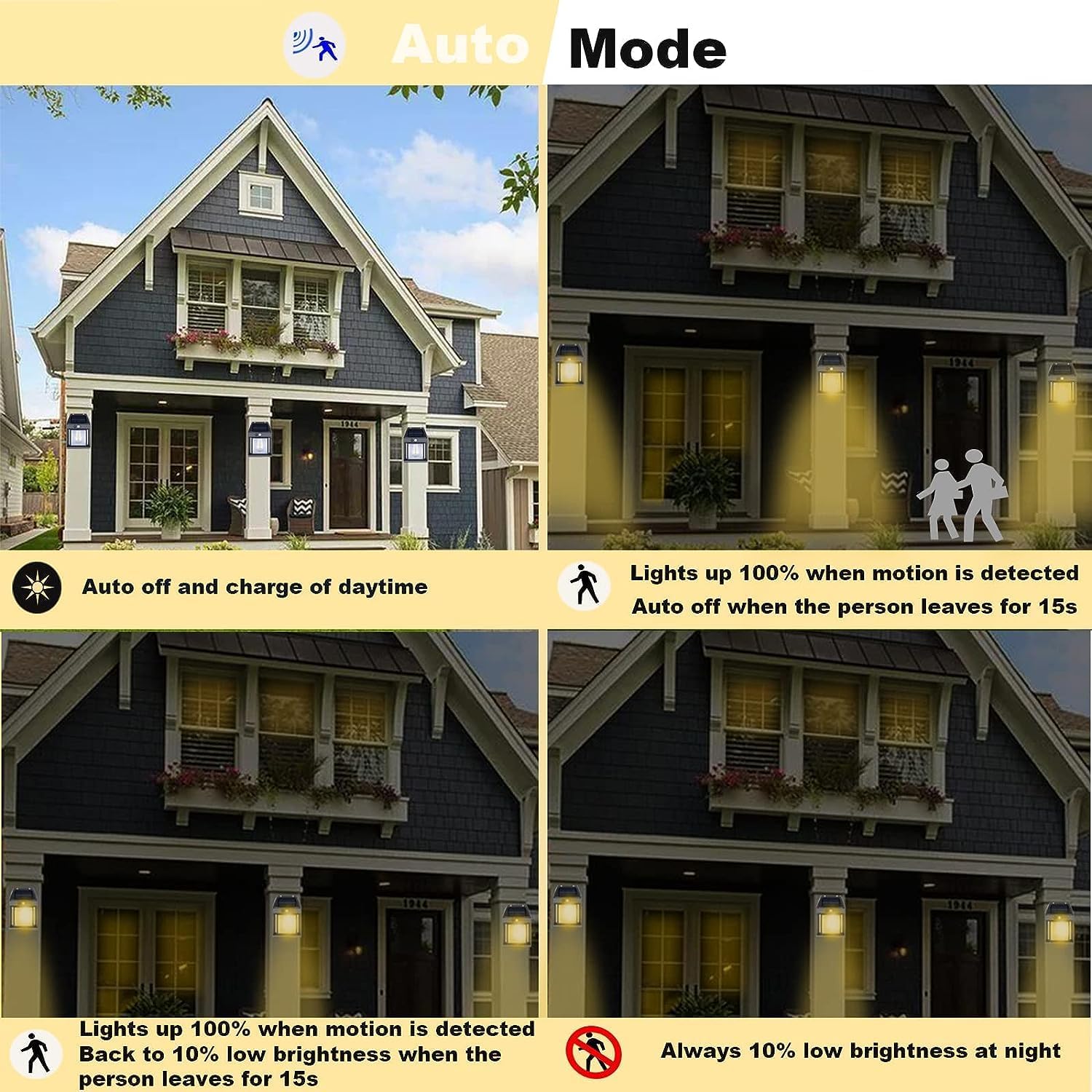 - Mode 2: 100% brightness on motion detection, reduces to 50% brightness after 15 seconds.